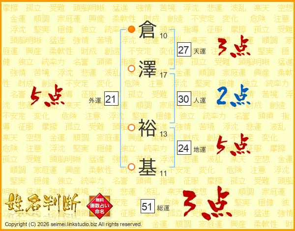 倉(10画)澤(17画) 裕(13画)基(11画)