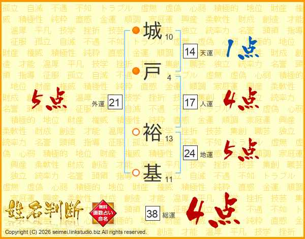 城戸裕基さんの総運は38画の4点!