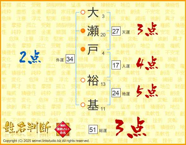 大(3画)瀬(20画)戸(4画) 裕(13画)基(11画)