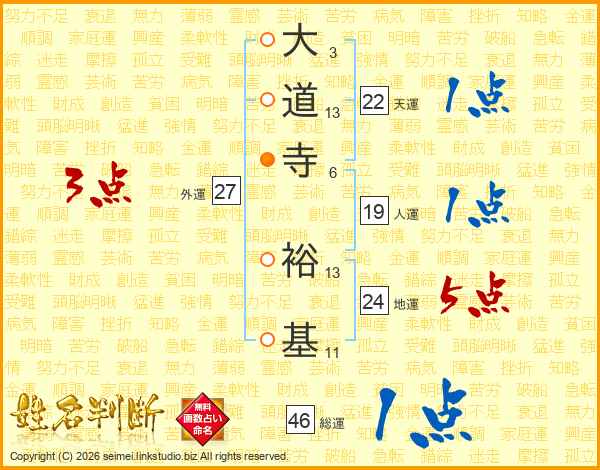 大(3画)道(13画)寺(6画) 裕(13画)基(11画)