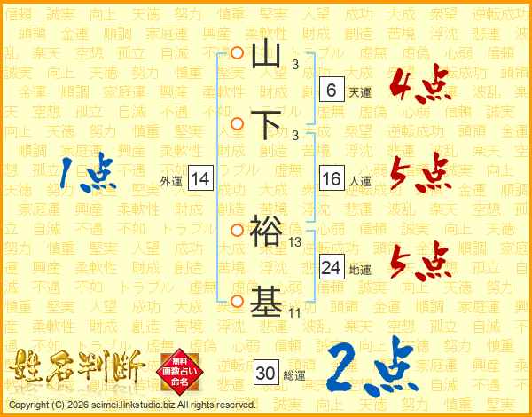 あなたの人生を表す1番重要な運勢です。生涯を通じて影響する総合運となり、主に50歳以降の晩年期に影響を及ぼします。苗字と名前の合計画数。