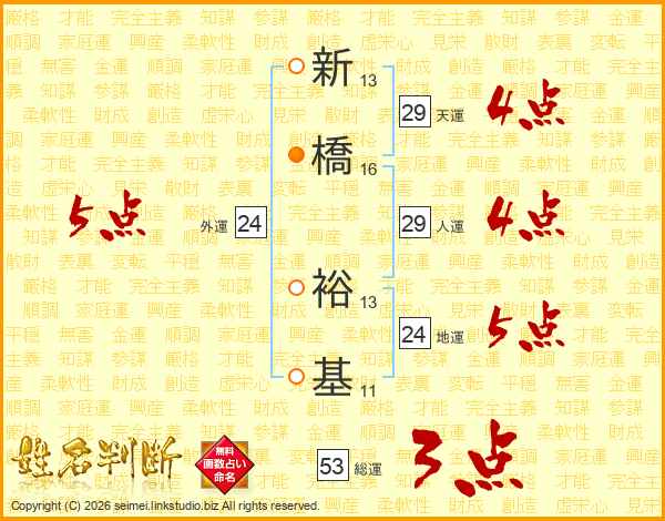 新(13画)橋(16画) 裕(13画)基(11画)
