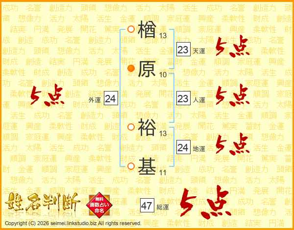 あなたの人生を表す1番重要な運勢です。生涯を通じて影響する総合運となり、主に50歳以降の晩年期に影響を及ぼします。苗字と名前の合計画数。