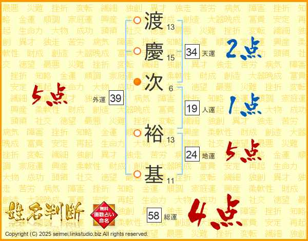 渡(13画)慶(15画)次(6画) 裕(13画)基(11画)