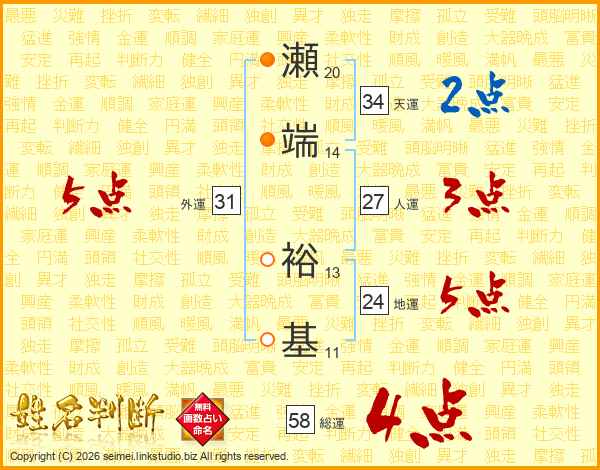 瀬端裕基さんの総運は58画の4点!