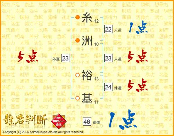 糸(12画)洲(10画) 裕(13画)基(11画)
