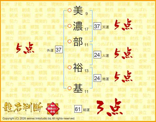 美(9画)濃(17画)部(11画) 裕(13画)基(11画)