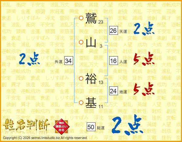 鷲(23画)山(3画) 裕(13画)基(11画)