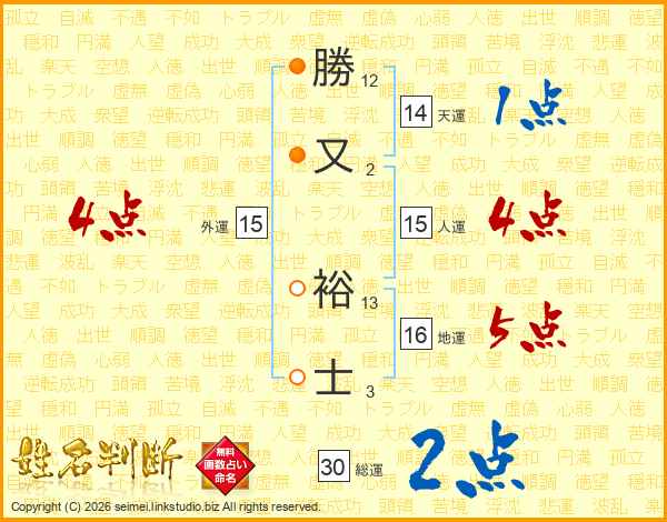 生活面を象徴する運勢です。外部から受ける影響力を表し、結婚運、家庭運や職場、環境への順応性を表します。総運から人運を引いた画数。姓や名が1文字の場合を除く。