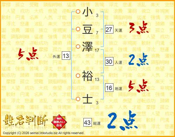 小豆澤裕士さんの総運は43画の2点!