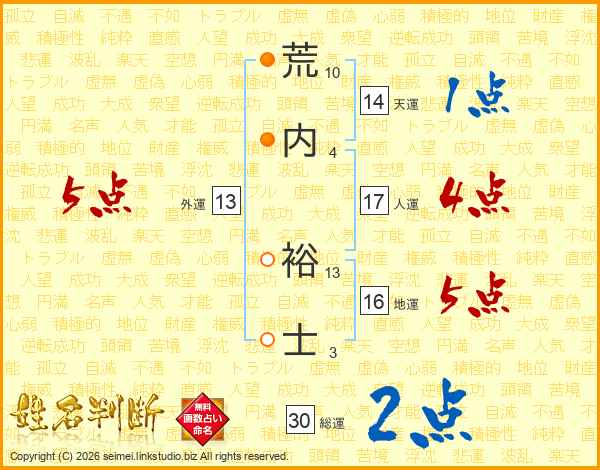 生活面を象徴する運勢です。外部から受ける影響力を表し、結婚運、家庭運や職場、環境への順応性を表します。総運から人運を引いた画数。姓や名が1文字の場合を除く。