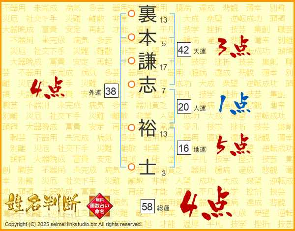 裏(13画)本(5画)謙(17画)志(7画) 裕(13画)士(3画)