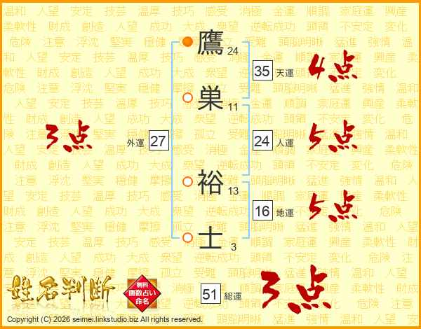 鷹巣裕士さんの総運は51画の3点!