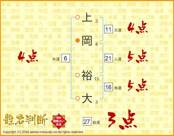 上岡裕大さんの人運は21画の5点!
