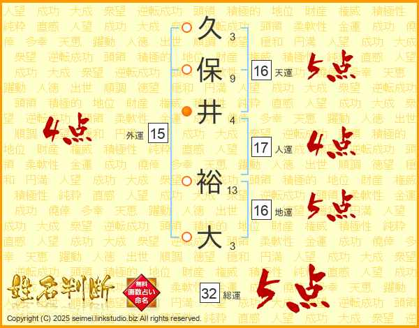 久(3画)保(9画)井(4画) 裕(13画)大(3画)