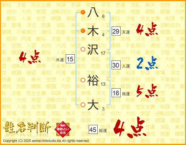 八(8画)木(4画)沢(17画) 裕(13画)大(3画)