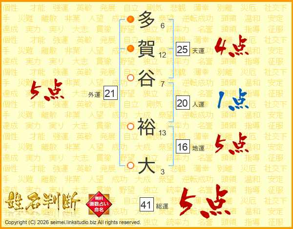 多賀谷裕大さんの総運は41画の5点!