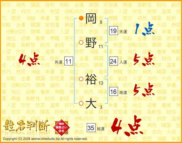 あなたの人生を表す1番重要な運勢です。生涯を通じて影響する総合運となり、主に50歳以降の晩年期に影響を及ぼします。苗字と名前の合計画数。