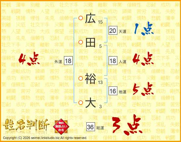 あなたの人生を表す1番重要な運勢です。生涯を通じて影響する総合運となり、主に50歳以降の晩年期に影響を及ぼします。苗字と名前の合計画数。