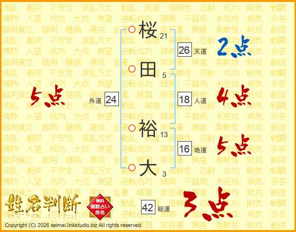 桜(21画)田(5画) 裕(13画)大(3画)