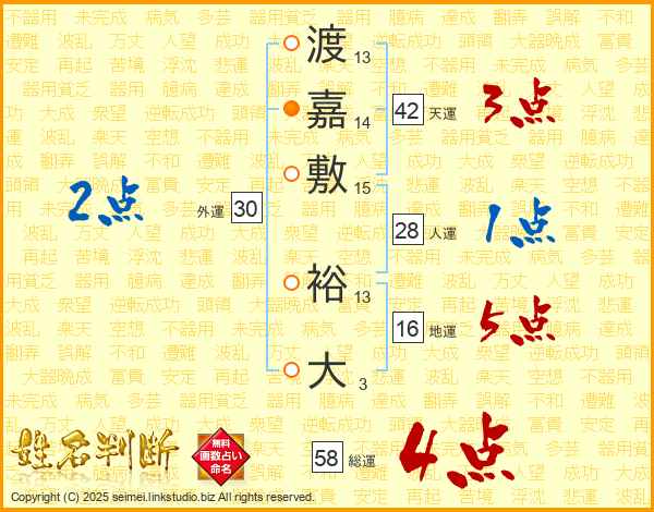 渡(13画)嘉(14画)敷(15画) 裕(13画)大(3画)