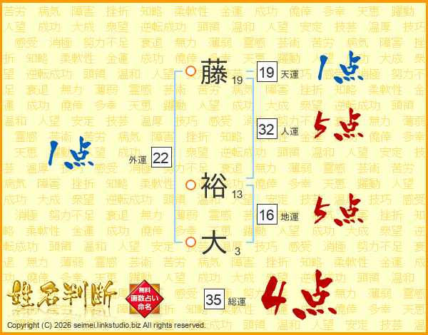 あなたの人生を表す1番重要な運勢です。生涯を通じて影響する総合運となり、主に50歳以降の晩年期に影響を及ぼします。苗字と名前の合計画数。