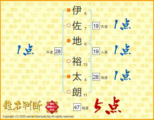伊(6画)佐(7画)地(6画) 裕(13画)太(4画)朗(11画)