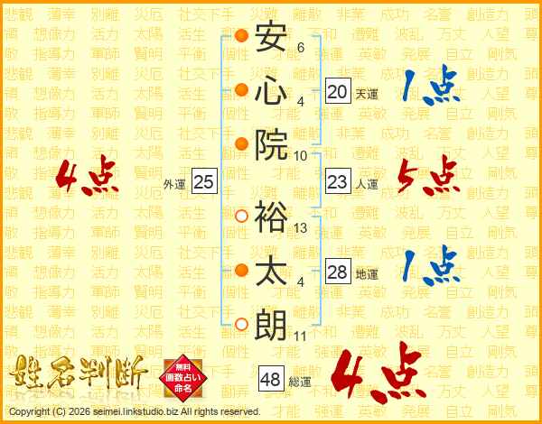 安(6画)心(4画)院(10画) 裕(13画)太(4画)朗(11画)