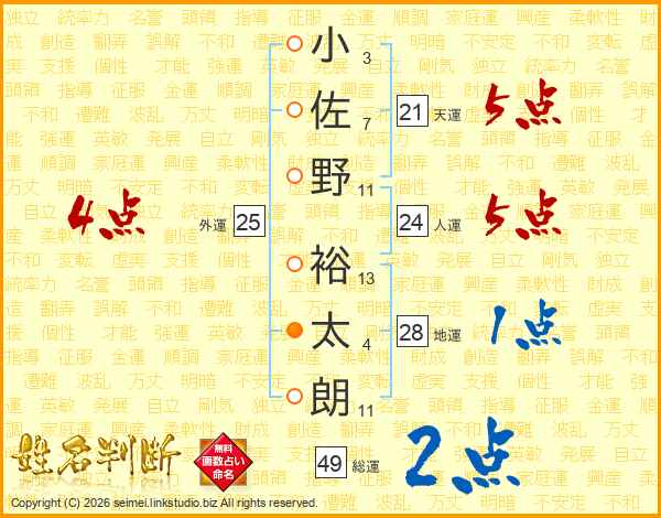 小(3画)佐(7画)野(11画) 裕(13画)太(4画)朗(11画)