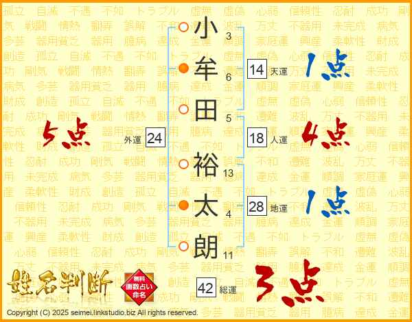 小(3画)牟(6画)田(5画) 裕(13画)太(4画)朗(11画)