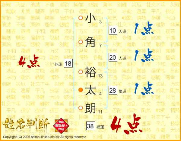 小(3画)角(7画) 裕(13画)太(4画)朗(11画)