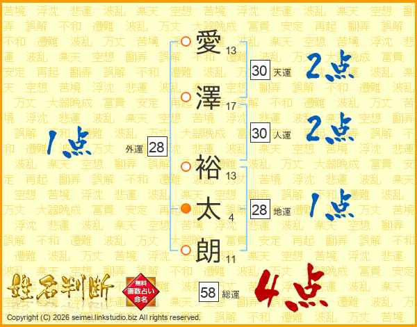 愛澤裕太朗さんの総運は58画の4点!