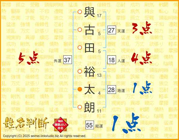 與(17画)古(5画)田(5画) 裕(13画)太(4画)朗(11画)