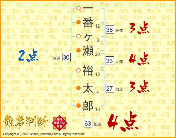 一番ヶ瀬裕太郎さんの総運は63画の4点!