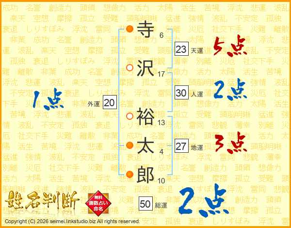 寺(6画)沢(17画) 裕(13画)太(4画)郎(10画)