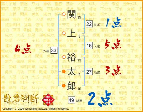 関(19画)上(3画) 裕(13画)太(4画)郎(10画)
