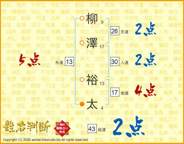 柳澤裕太さんの天運は26画の2点!