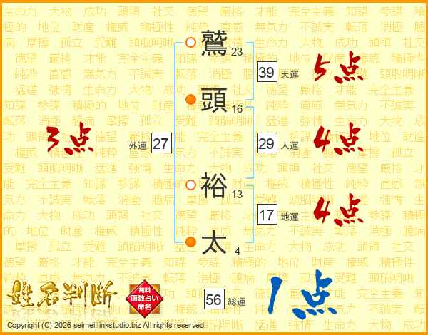 鷲(23画)頭(16画) 裕(13画)太(4画)
