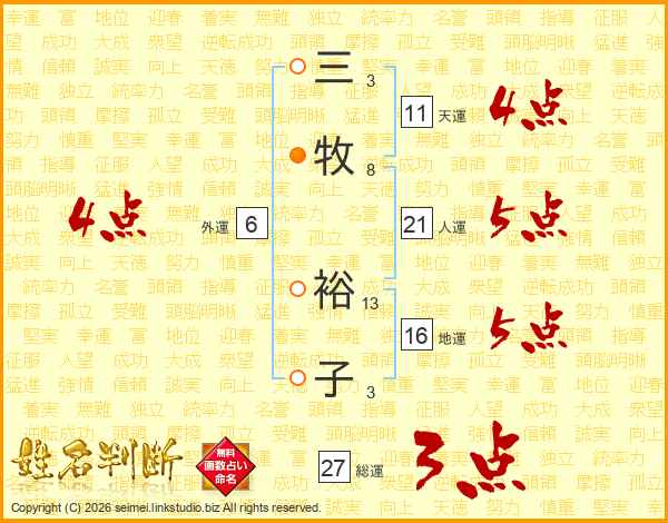 あなたの人生を表す1番重要な運勢です。生涯を通じて影響する総合運となり、主に50歳以降の晩年期に影響を及ぼします。苗字と名前の合計画数。