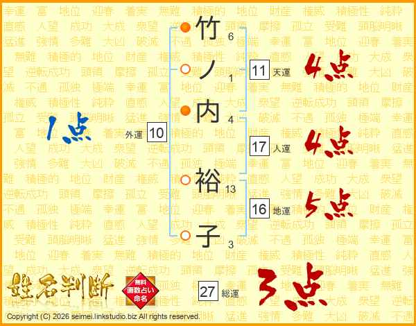 竹ノ内裕子さんの総運は27画の3点!