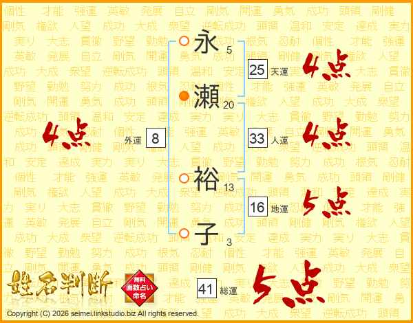 永(5画)瀬(20画) 裕(13画)子(3画)