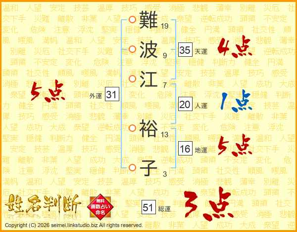難(19画)波(9画)江(7画) 裕(13画)子(3画)