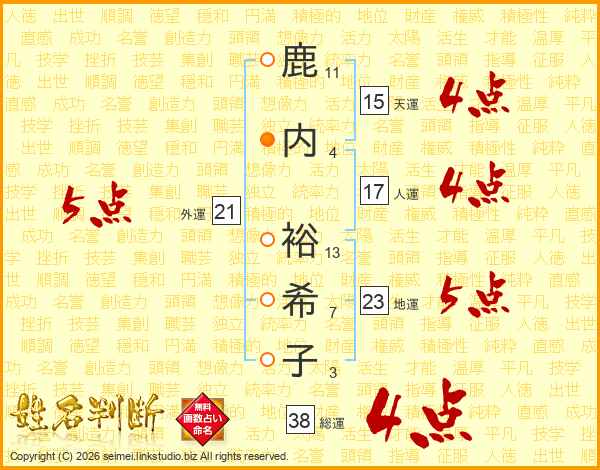 鹿(11画)内(4画) 裕(13画)希(7画)子(3画)