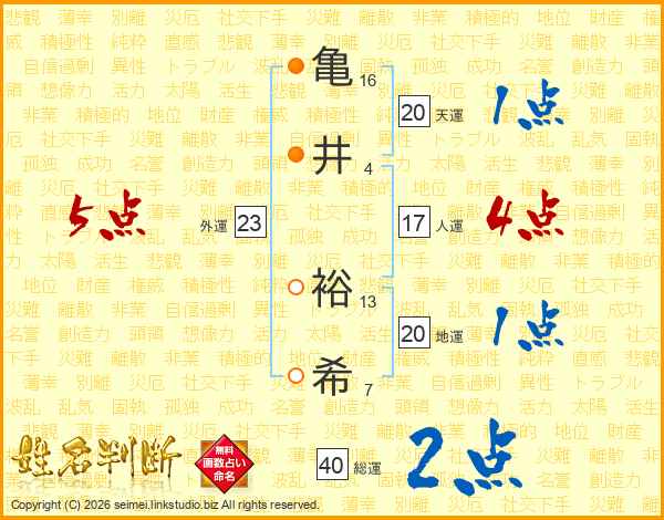 亀(16画)井(4画) 裕(13画)希(7画)