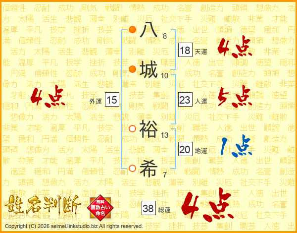 八(8画)城(10画) 裕(13画)希(7画)