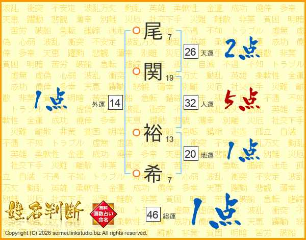 尾関裕希さんの天運は26画の2点!