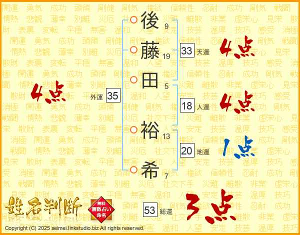 後(9画)藤(19画)田(5画) 裕(13画)希(7画)