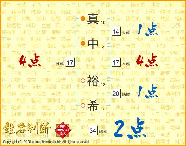 真中裕希さんの人運は17画の4点!