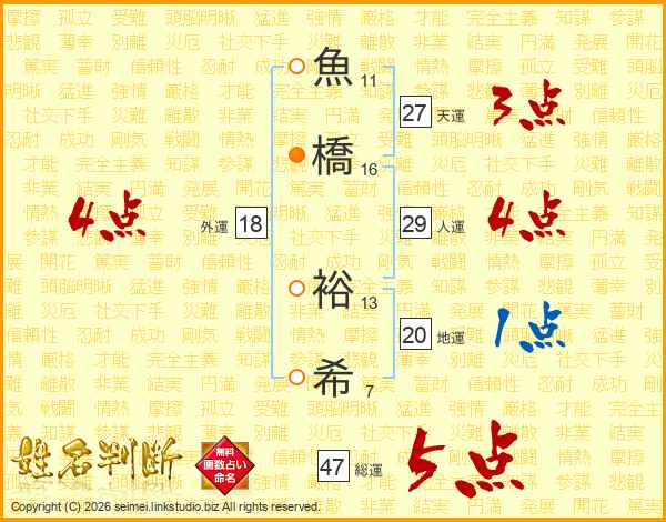 魚(11画)橋(16画) 裕(13画)希(7画)