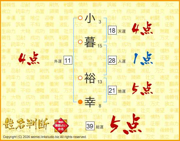 小(3画)暮(15画) 裕(13画)幸(8画)